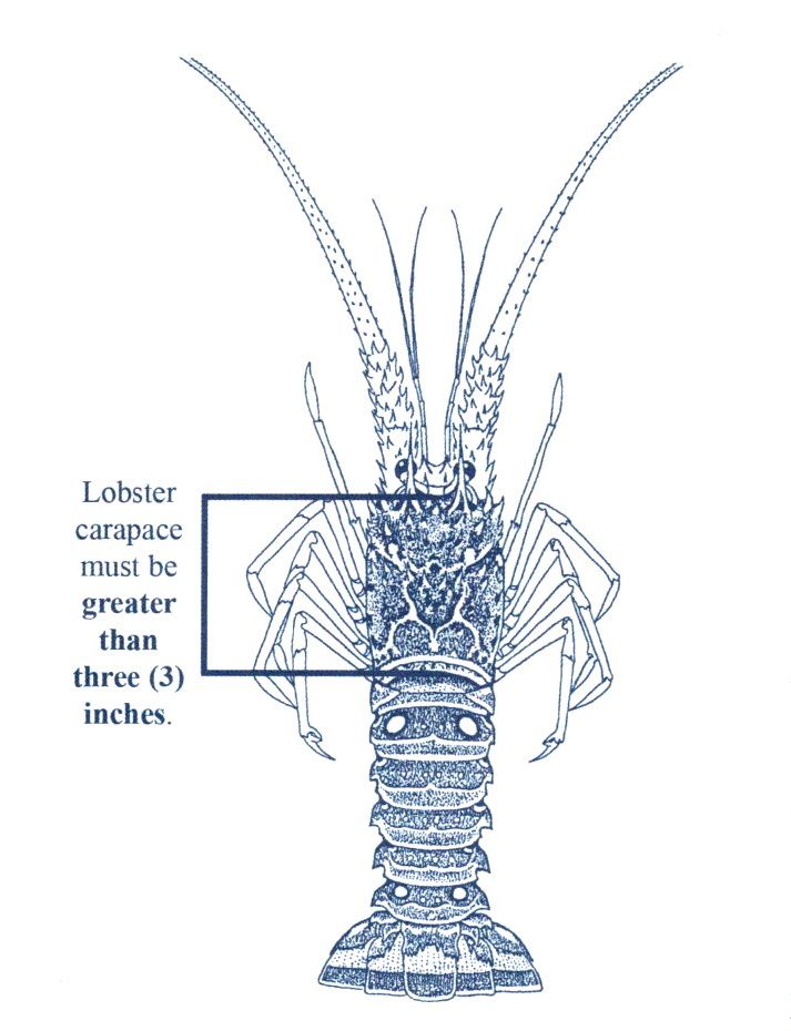 Each lobster that you harvest must have a carapace measuring 3 inches or bigger. Any lobster smaller than this and also any egg-bearing lobster must be released unharmed immediately. A lobster that you catch needs to be measured in the water, so divers and snorkelers are required to have a measuring gauge with them at all times while hunting. Also, you have to bring the lobster to shore alive before cleaning it.